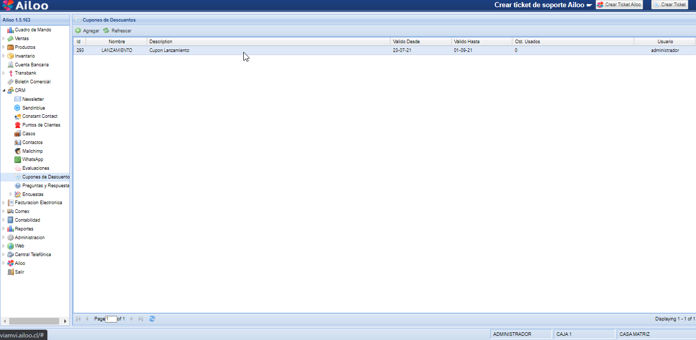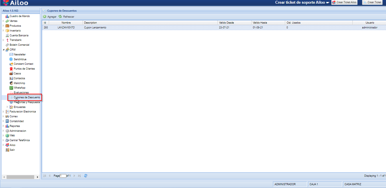 a) Para crear un cupón de descuento, en primer lugar debemos dirigirnos a CRM > CUPONES DE DESCUENTOS > AGREGAR.