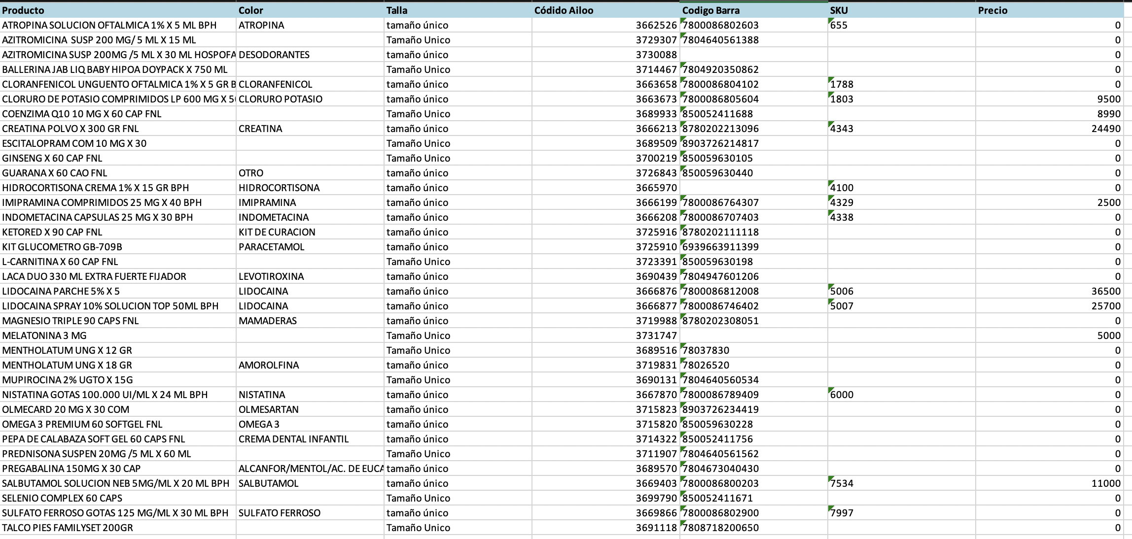 Una vez descargado, se obtendrá un archivo Excel. En este archivo solo debe modificarse la columna Precio.