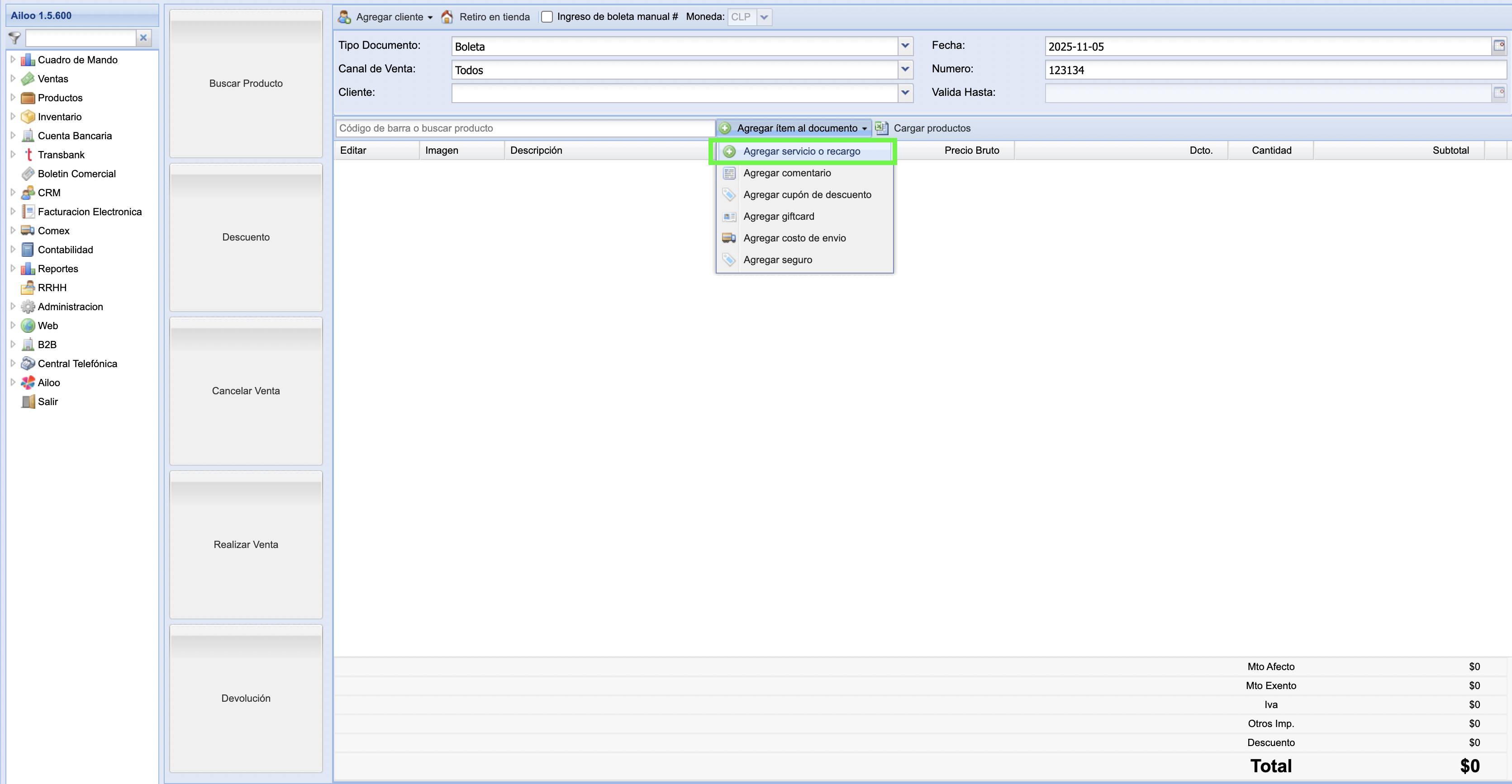En el punto de venta, haz clic en el botón “Agregar ítem al documento”. Se desplegará una lista de opciones; selecciona “Agregar servicio o recargo”.
