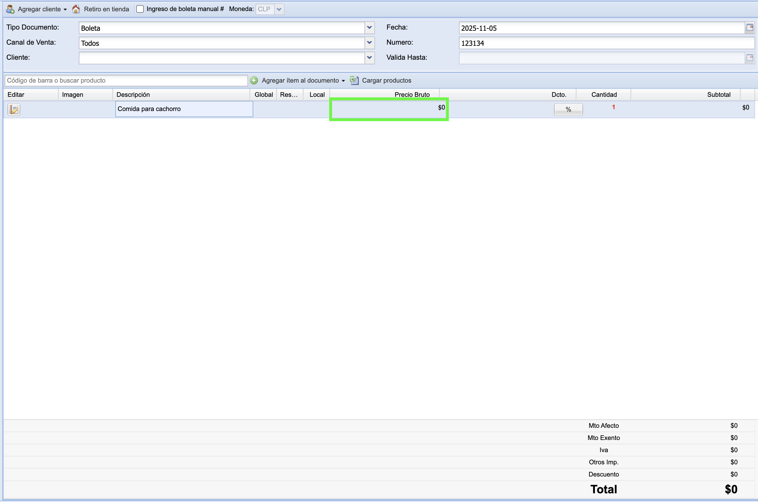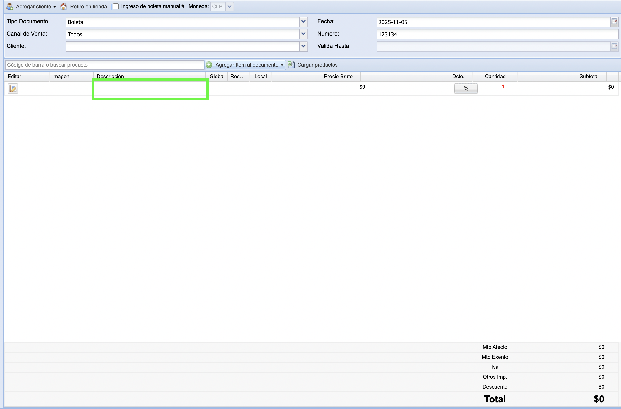Una vez seleccionada la opción, se añadirá una nueva línea al punto de venta. Para editarla, haz doble clic en el recuadro verde (como se muestra en la imagen) e ingresa la descripción del producto que estás vendiendo.