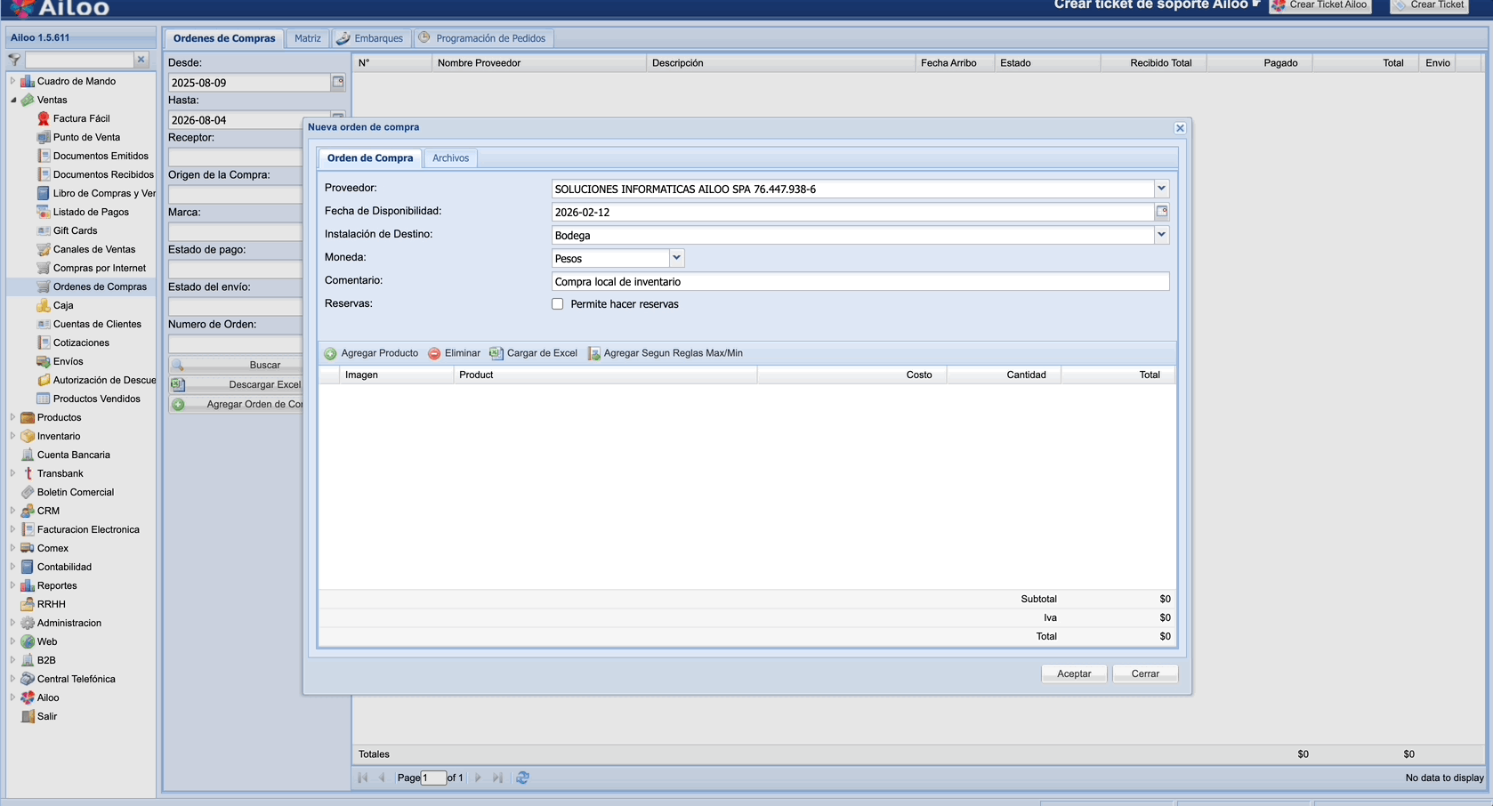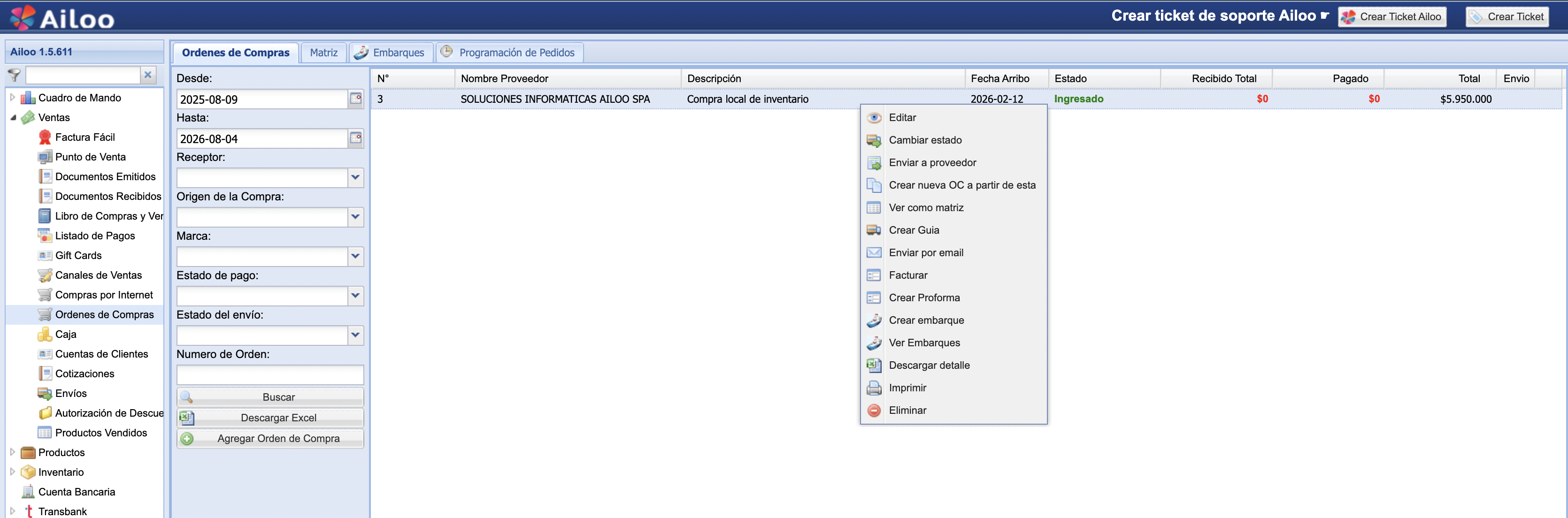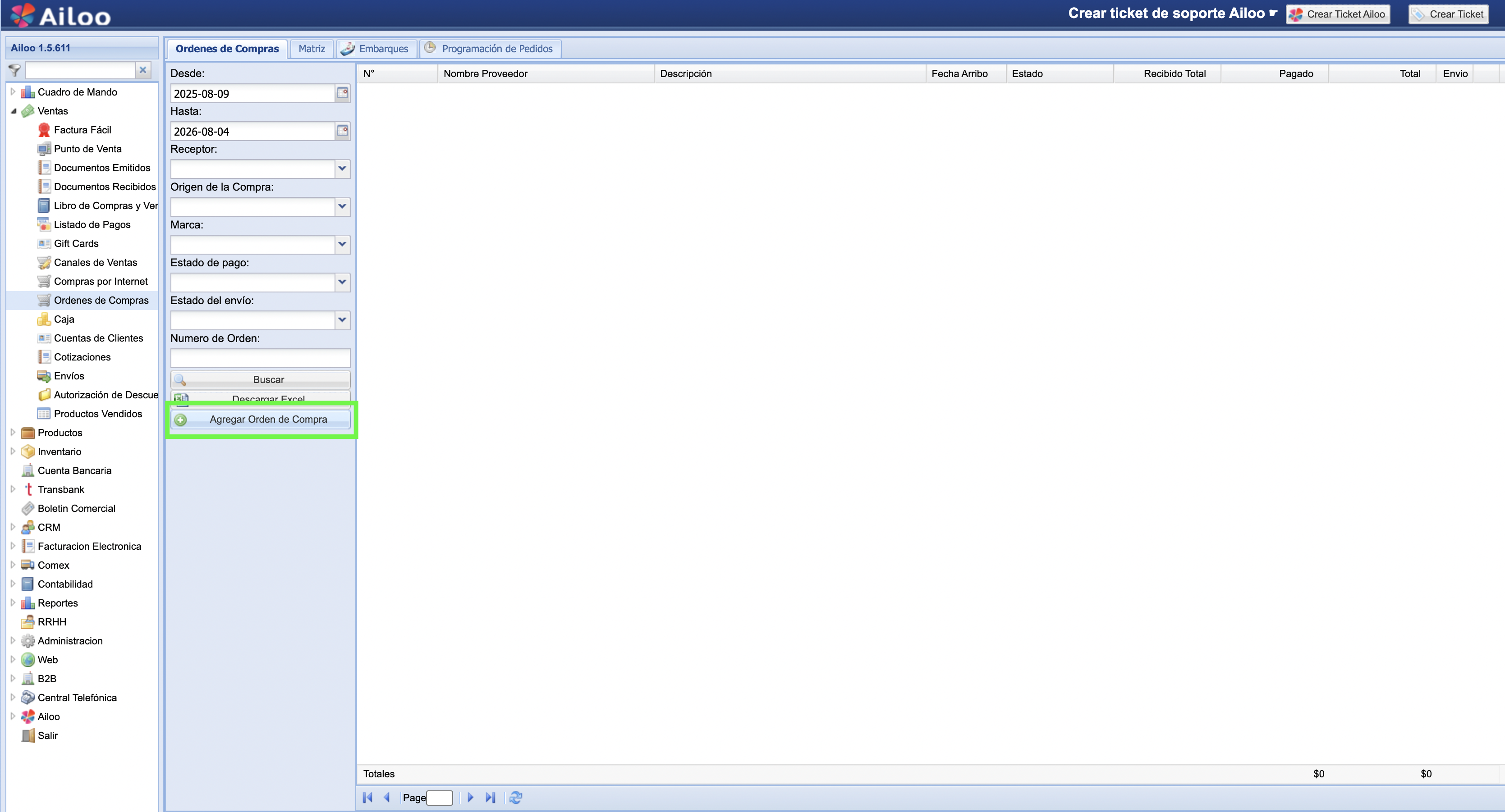 - Eliminar: Elimina la orden de compra del sistema sin posibilidad de recuperación.