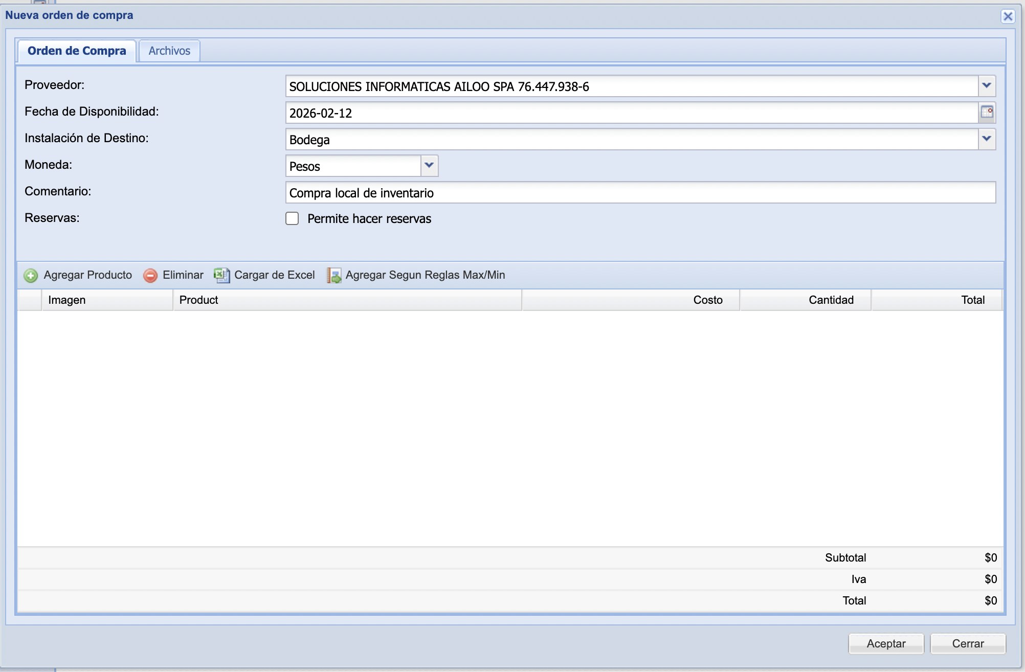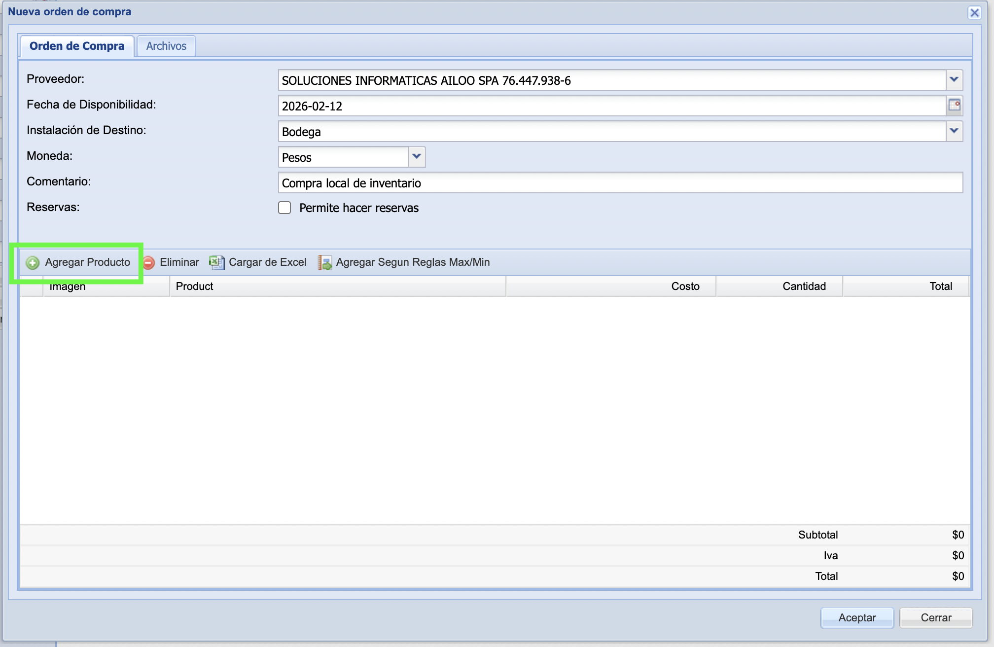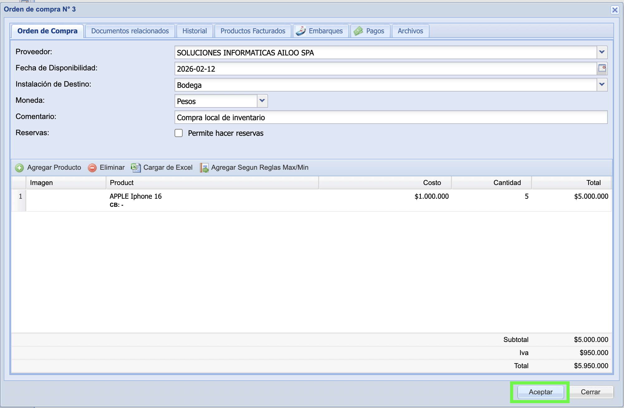 5. Una vez agregados todos los productos, deberá hacer clic en “Aceptar” para crear la orden de compra. Con este paso la orden de compra ya se encuentra creada.